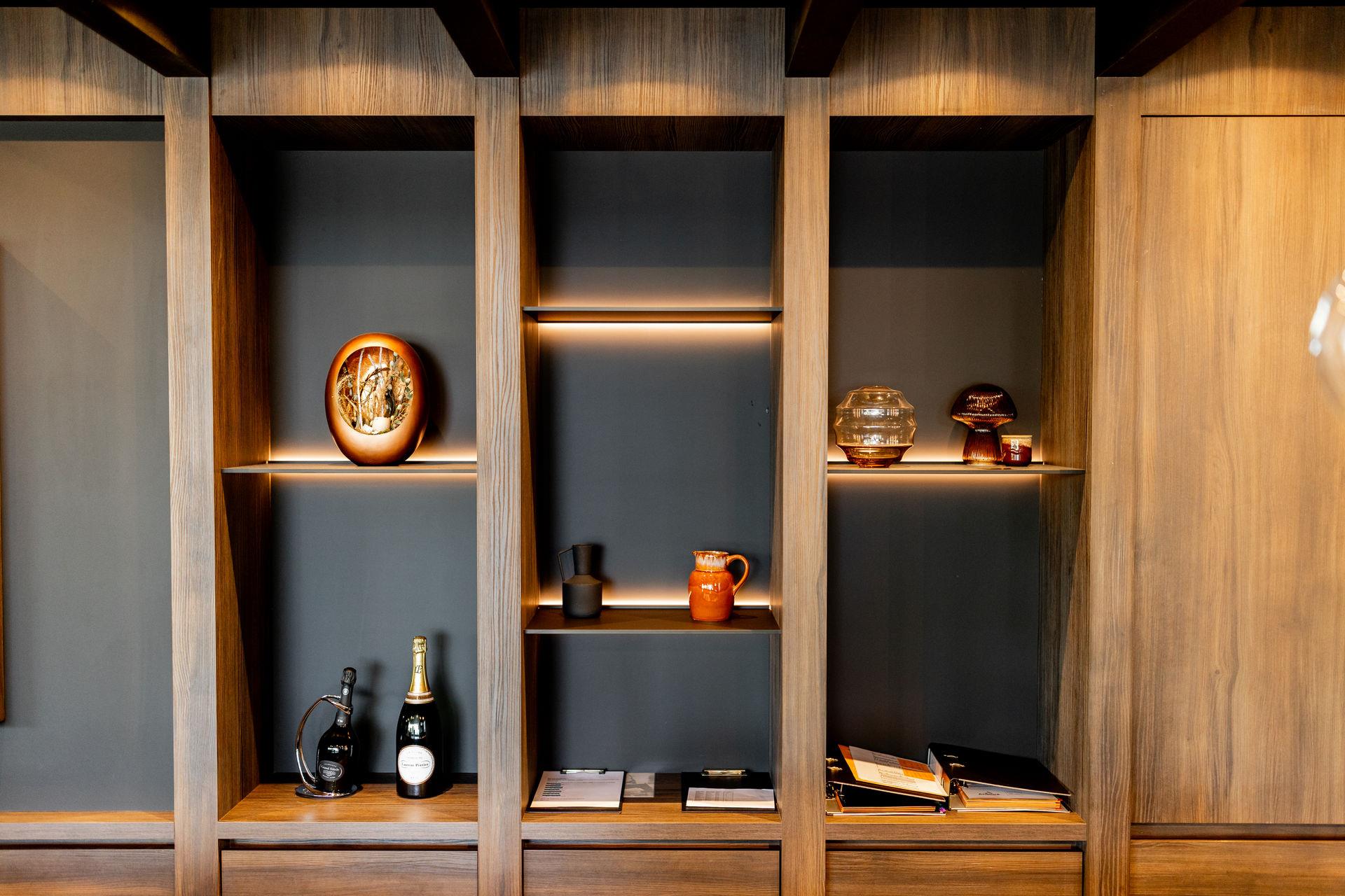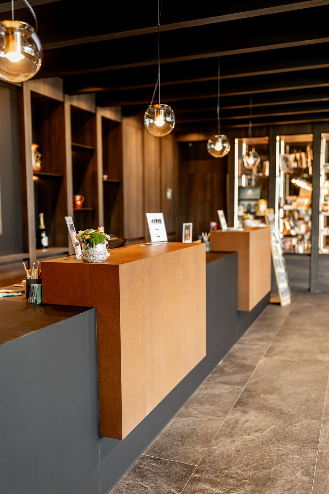 From the moment guests enter the resort, they are welcomed by an inviting reception desk in matte black, highlighted with dark wood accents. Behind it, a decorative shelving wall with indirect lighting creates an elegant, refined atmosphere.