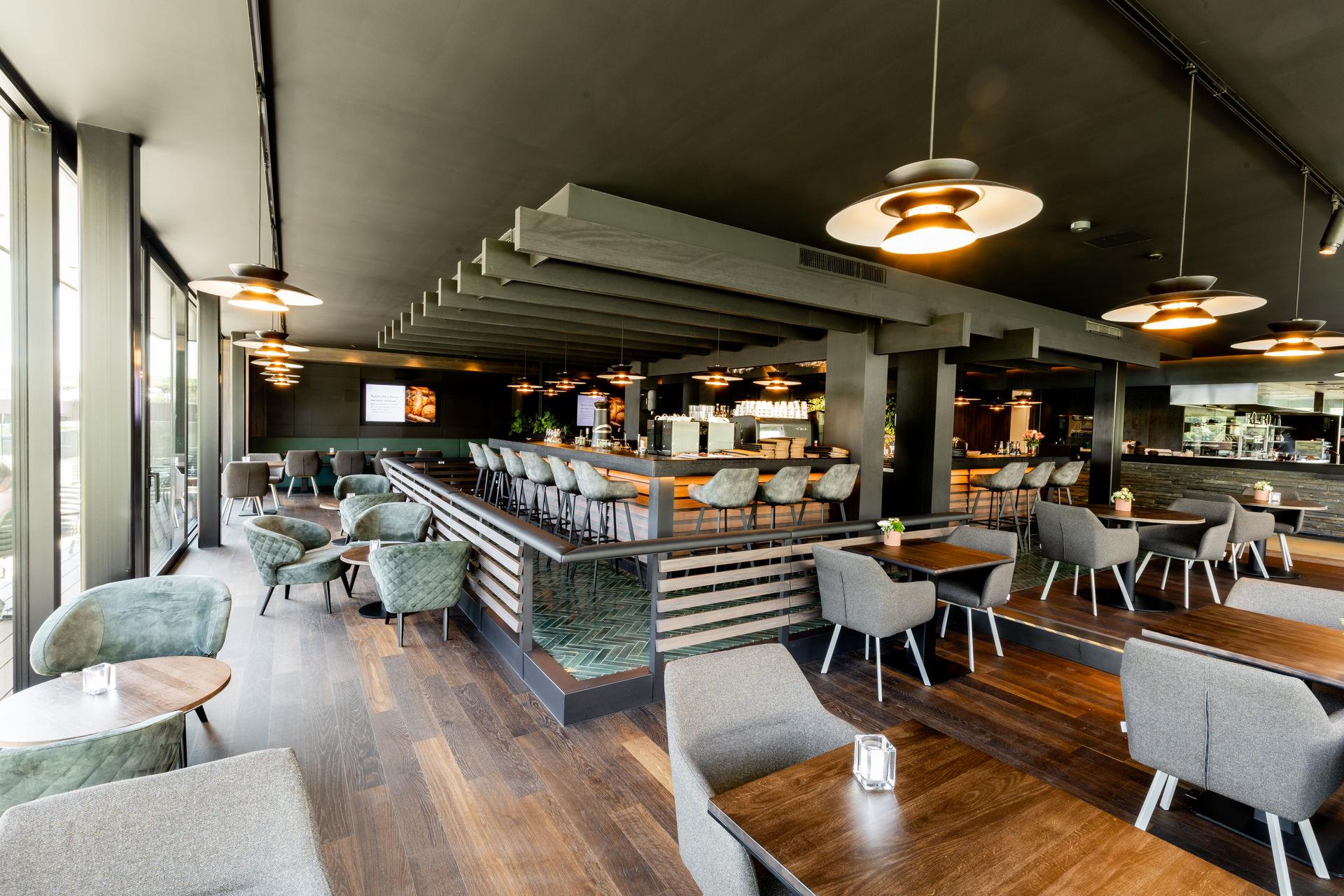 The bar impresses with a striking counter, complemented by stylish stools. A distinctive wooden ceiling structure subtly defines the space and adds a sense of order. On the outer side of the counter, wide wooden beams and fine wooden slats create varied and eye-catching accents.