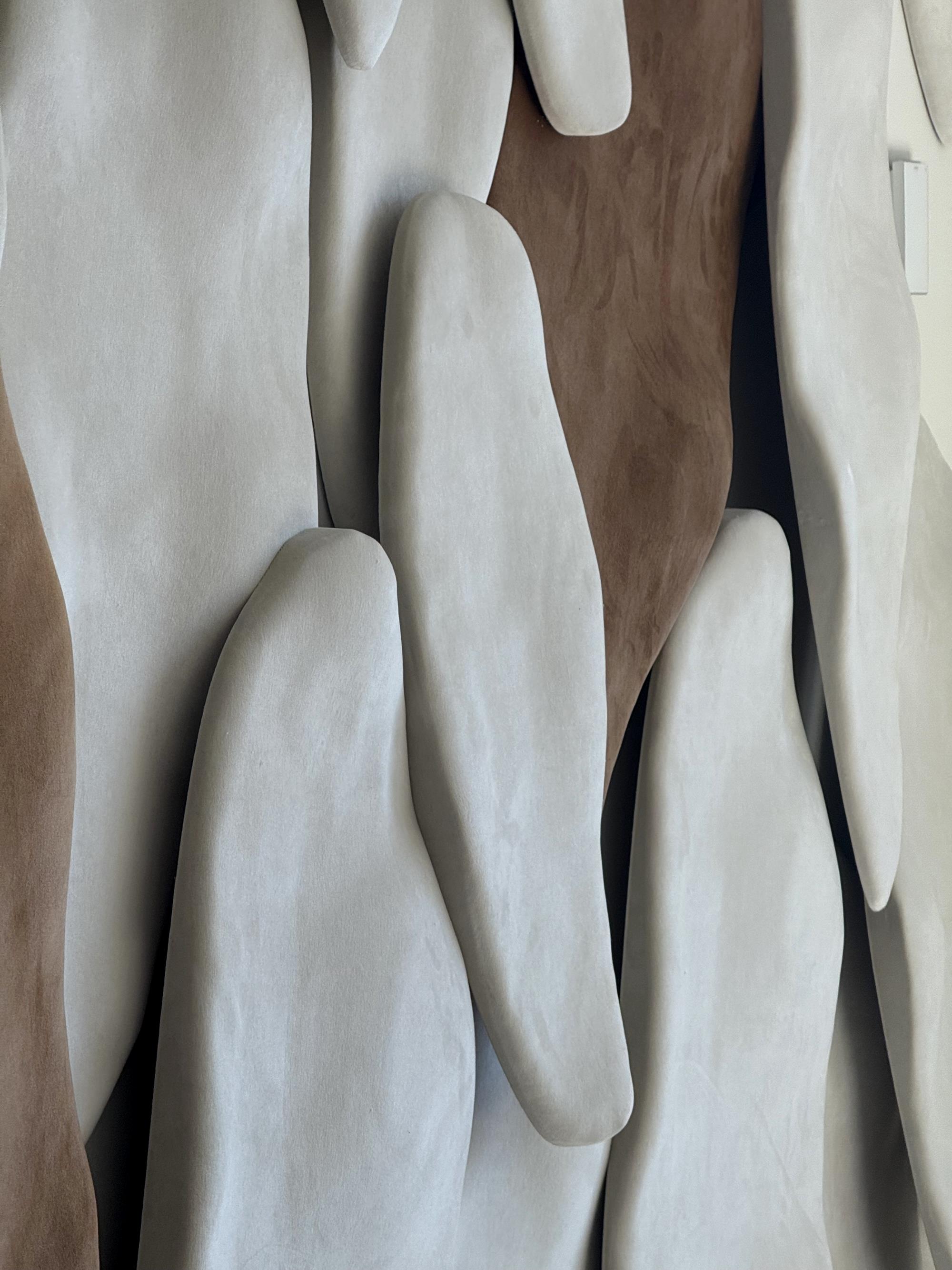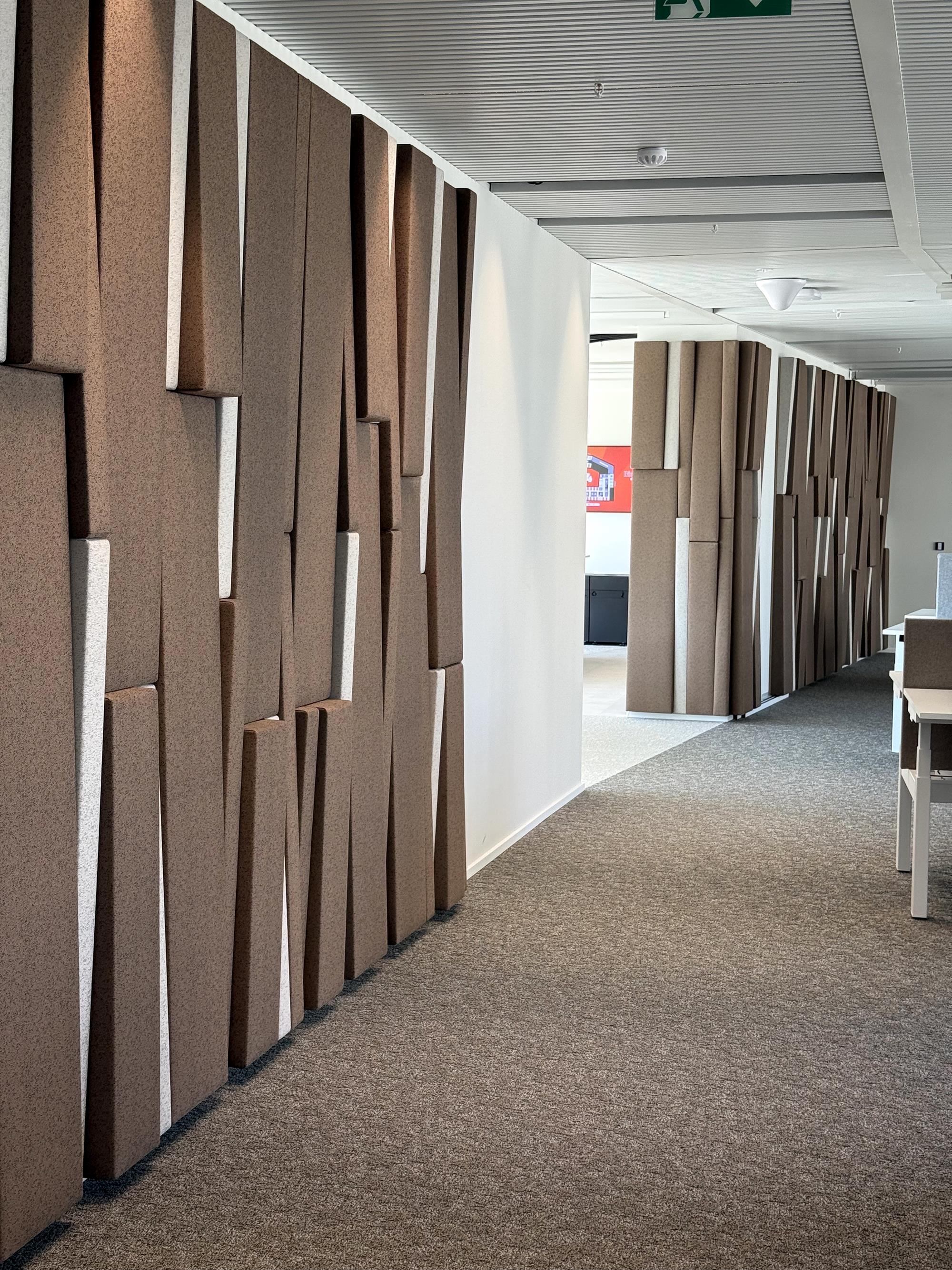 Les étages supérieurs accueillent le département de direction. L’accent a été mis sur un environnement de travail calme et qualitatif. Des éléments acoustiques aux formes évoquant des feuilles ou des coins améliorent de manière ciblée l’acoustique des open spaces et des couloirs. Fixés au mur et recouverts de tissu, ces éléments en mousse réduisent efficacement la réverbération tout en apportant une dimension esthétique.