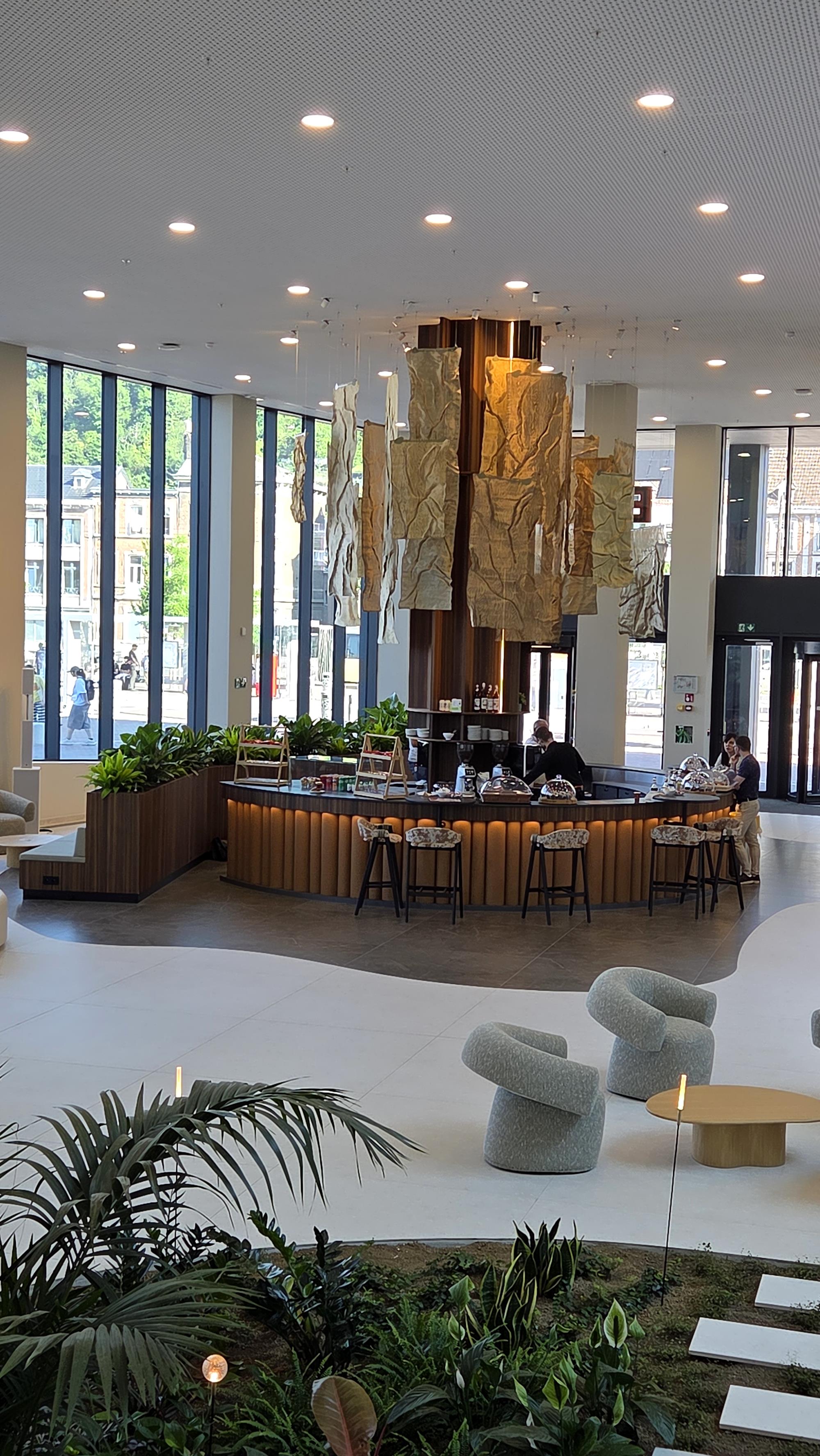 Le comptoir d’accueil moderne constitue le point central de l’espace. Son design singulier, marqué par des colonnes semi-circulaires et un éclairage indirect, confère au lieu une élégance affirmée. La qualité d’exécution souligne le savoir-faire artisanal de Palm et fait de ce comptoir un véritable élément emblématique.