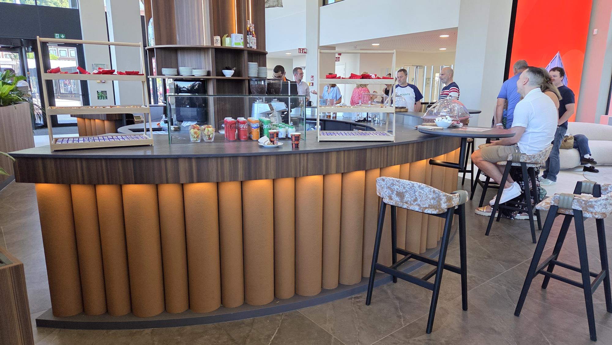 Derrière la zone publique se trouve un espace barista réservé aux collaborateurs. Le bar arrondi, équipé d’un comptoir et de tabourets, fonctionne comme un lieu de rencontre informel. Des tons bruns chaleureux, une façade éclairée indirectement et des formes fluides créent une ambiance accueillante. Des banquettes et de petites tables en bois complètent l’aménagement. Des jardinières intégrées aux dossiers servent à la fois de séparation subtile et renforcent le confort de l’espace.