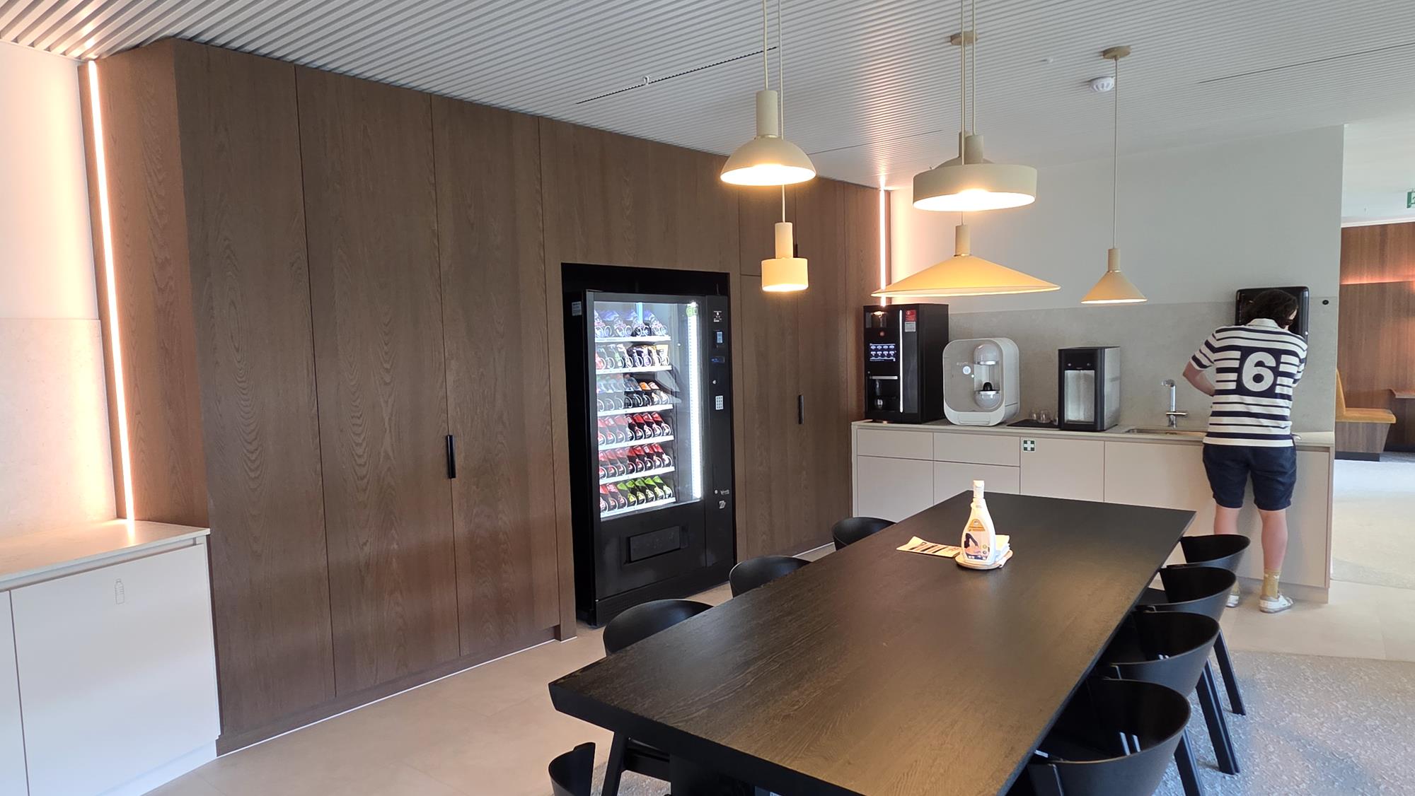 Pour les pauses café quotidiennes, un coffee corner ouvert a été aménagé à proximité des bureaux. Une grande armoire en bois foncé offre un vaste espace de rangement et intègre un distributeur de snacks. Des meubles plus clairs et plus bas servent de plans de travail pour les machines à café et leurs accessoires. Ils structurent clairement la kitchenette ouverte.