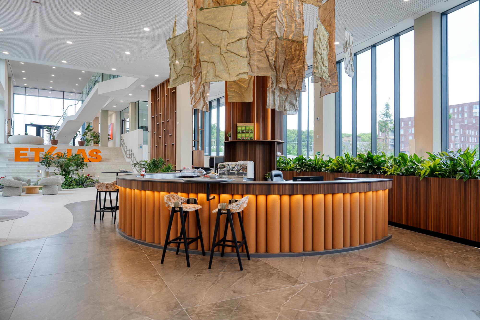 Chaque jour, de nombreux clients et visiteurs accèdent à l’espace d’accueil et d’attente ouvert situé au rez-de-chaussée du bâtiment. De hauts claustras en bois foncé structurent l’espace et créent des zones discrètes tout en préservant la sensation d’ouverture. Des banquettes, des chaises aux formes organiques et de petites tables complètent l’ensemble et offrent un espace d’attente confortable. Des tables hautes avec tabourets ainsi que des bacs à plantes en bois réalisés sur mesure le long des fenêtres apportent du rythme et une atmosphère naturelle.