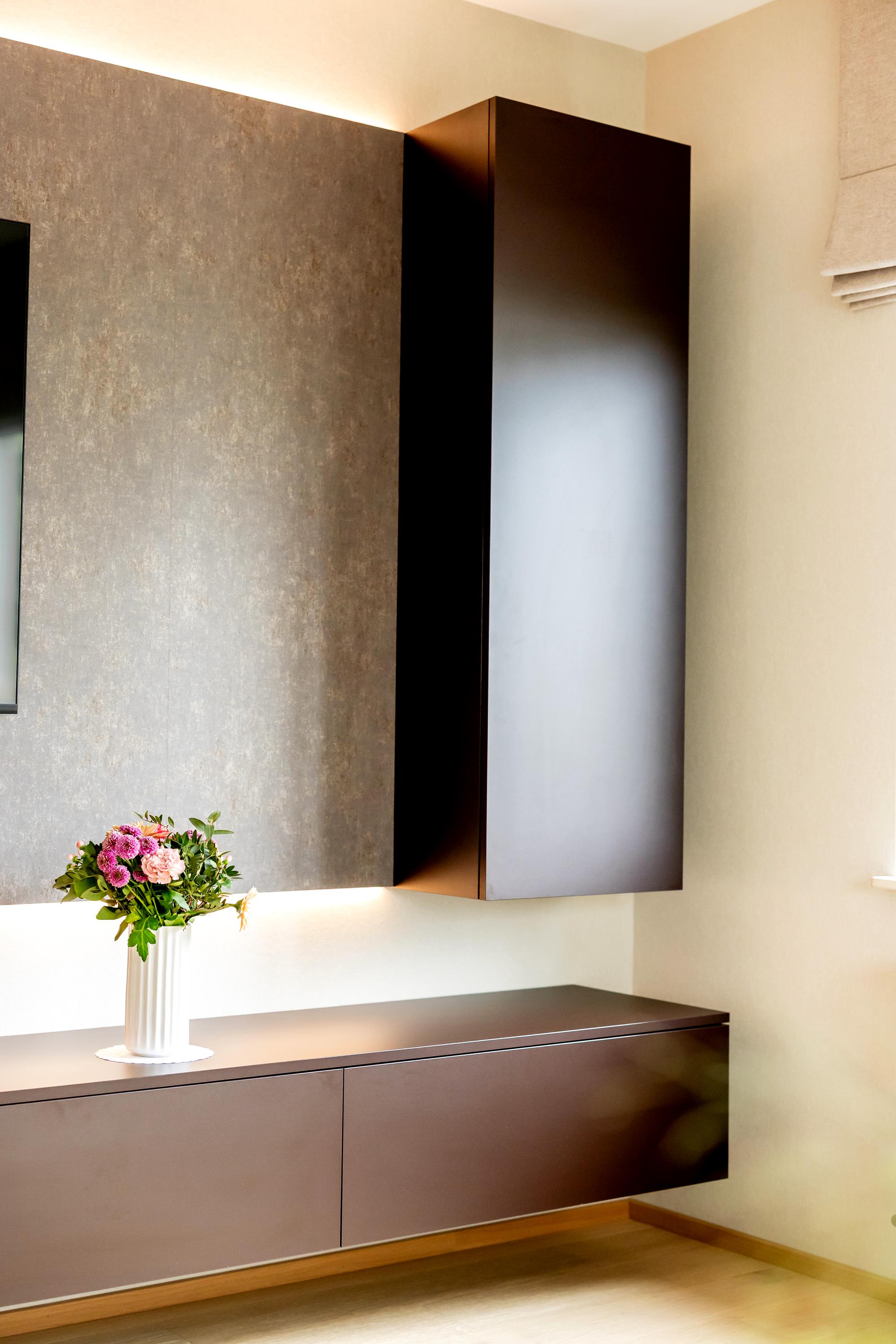 Im Wohnzimmer realisierten wir eine stilvolle Fernsehwand. Ein Sideboard in dunklem Braun dient als Basis und bietet praktischen Stauraum. Darüber setzt eine grau-braune TV-Wand mit indirekter Beleuchtung und einem vertikalen Hängeschrank moderne Akzente und rundet das Raumkonzept ab.